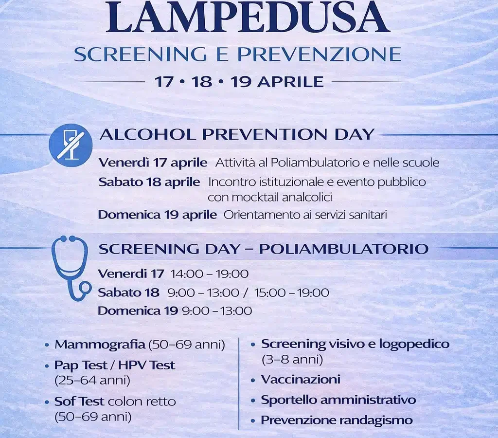 L’Azienda Sanitaria Provinciale di Palermo organizza dal 17 al 19 aprile a Lampedusa l’Alcohol Prevention Day 2026, affiancato da uno Screening Day con visite gratuite al Poliambulatorio, nell’ambito di un’iniziativa complessiva di promozione della salute rivolta all’intera comunità.