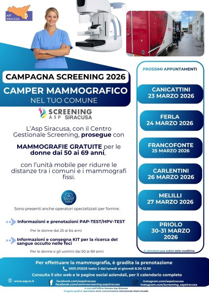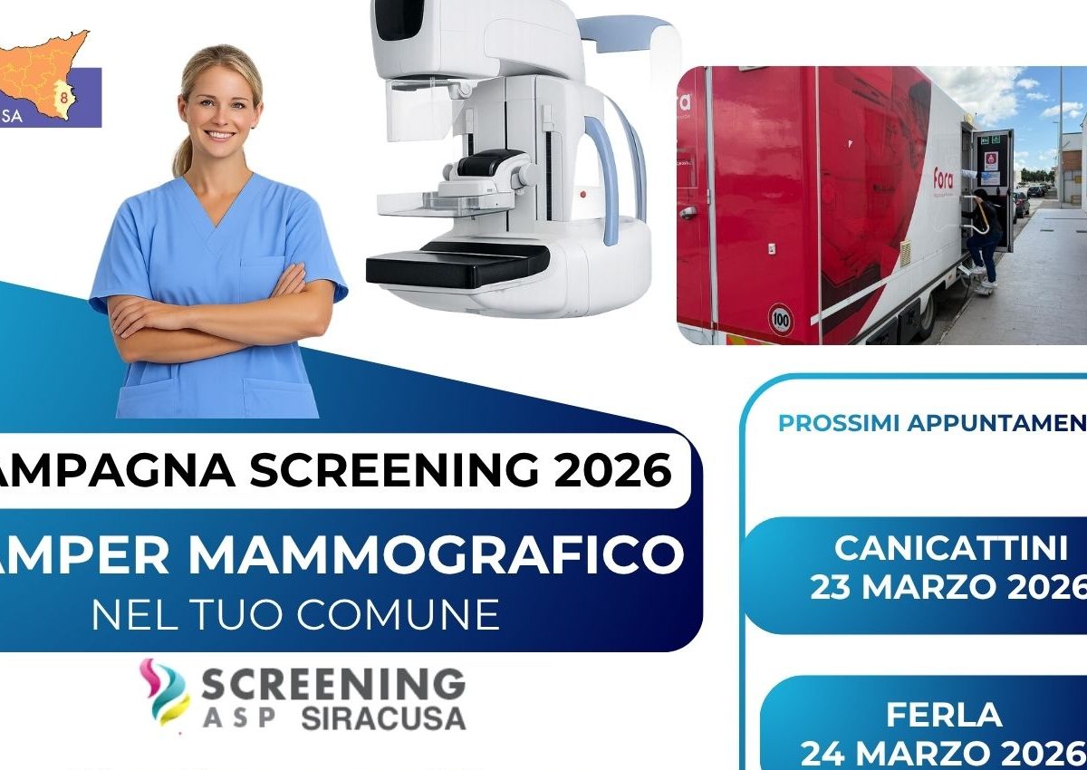 L’Asp di Siracusa prosegue il programma di salute di prossimità con il mezzo mobile mammografico, volto a garantire l’accesso alla prevenzione del tumore al seno anche nelle aree distanti dai centri mammografici fissi: dopo l’appuntamento del 23 marzo a Canicattini, il 24 marzo il camper sarà nel comune di Ferla dove, nell’area della Guardia Medica, oltre alle mammografie, potranno essere eseguiti PAP test (25-29 anni) ed HPV test (30-64 anni) per la prevenzione del tumore del collo dell’utero.