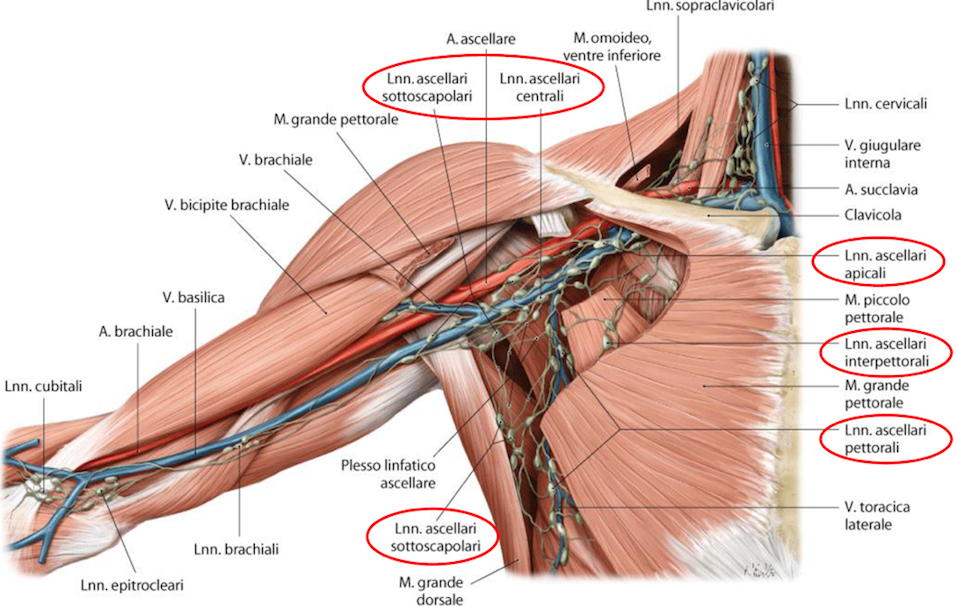 Nel caso specifico, abbiamo già descritto in un’altra puntata che il vaccino viene inoculato nella regione del deltoide (https://www.sanitainsicilia.it/gocce-di-anatomia-linoculazione-del-vaccino-la-regione-del-muscolo-deltoide_408915/). La linfa, che proviene dagli arti si muove in direzione “centripeta”, ossia verso il torace, e quella proveniente dall’arto superiore attraversa la regione ascellare, quel territorio del nostro corpo delimitata da un pilastro anteriore (costituito dal margine laterale del muscolo grande pettorale) e un pilastro posteriore (formato dai margini laterali dei muscoli grande dorsale e grande rotondo) e che contiene non solo una trentina di linfonodi, suddivisi in vari raggruppamenti (vedi figura), ma anche numerose altre importanti strutture, come ad esempio i vasi ematici e i nervi dell’arto superiore. L’ingrandimento di questo pacchetto linfonodale può generare fastidio nel paziente a seguito della compressione di una o più di queste strutture. Un’indagine radiologica mirata può aiutare a escludere cause gravi, quali ad esempio una neoplasia mammaria, in quanto anche la linfa proveniente da circa i due terzi della mammella (di cui abbiamo brevemente parlato qui: https://www.sanitainsicilia.it/gocce-di-anatomia-allattando-non-si-trasmette-il-virus-lanatomia-aiuta-a-capire-il-perche_409262/) raggiunge i linfonodi ascellari e con essa eventuali metastasi da carcinoma. Le dimensioni del linfonodo inferiori a due centimetri e, soprattutto, la rapida remissione della sintomatologia aiutano comunque il medico a tranquillizzare il paziente sulla benignità del fenomeno.